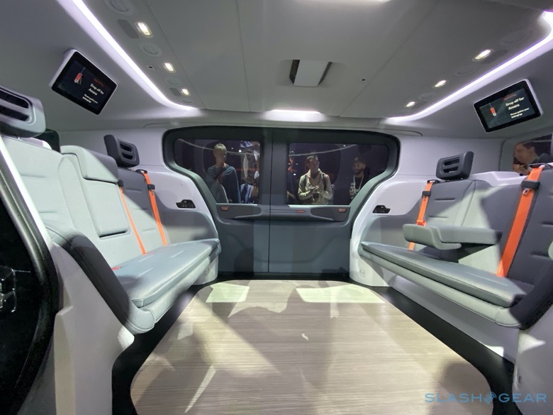 Each seat gets a bank of ports to charge their phone or other devices; two displays hanging from the roof show status messages, give you a schedule of pick-ups and drop-offs, and remind you to buckle up. Cruise opted for sliding doors rather than hinged, not just because they look cool but because they won't swing out and inadvertently smack cyclists off their bikes.
