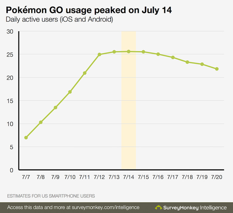 This isn't meant to be a definitive indication that the game's popularity has run its course, mind you. SurveyMonkey's data shows that daily usage of the app peaked at just over 25 million users on July 14th, with July 20th seeing a little less than 23 million. There's a small difference between the two, but a noticeable one nonetheless.