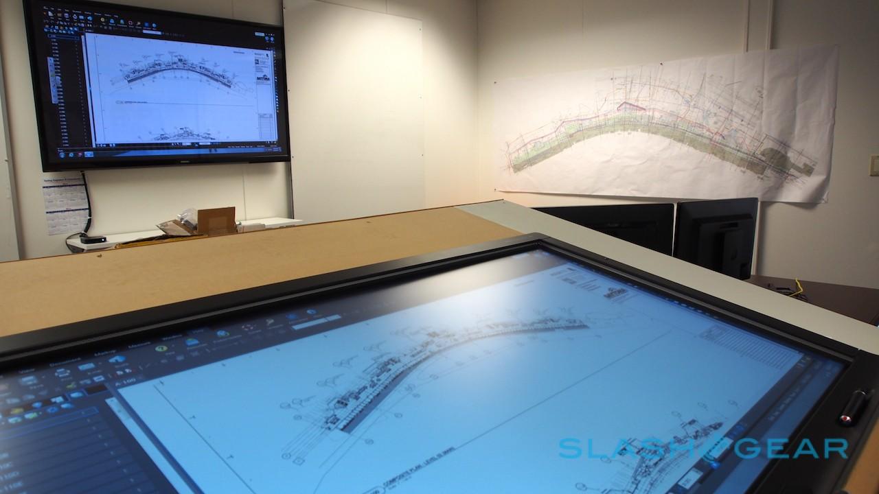So, at the surprisingly spacious site office – known colloquially as the "Command Center" – the two firms and their subcontractors work from, roughly a half-mile from the track, gadgets have replaced the building industry's more typical tools. 60-inch LCDs dot the walls, each hooked up to an Apple TV for easy sharing of plans and more (PC users rely on AirParrot to link into AirPlay too), while there are more than 100 iPads on site giving access to all of the documentation along with real-time commenting. Superintendents create daily site reports by dictating with Siri and recording video, rather than more time-consuming text.