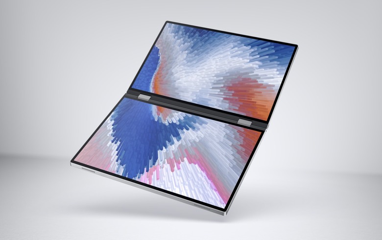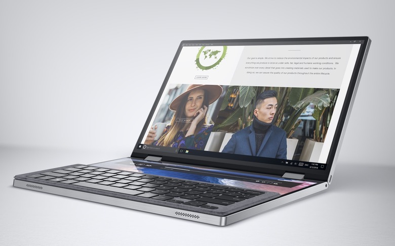 A 360-degree hinge allows the concept laptop to spin all the way around, from a traditional notebook form-factor, through an easel-style, to a tablet. Both of the displays are designed to work with both finger-touch input and a digital stylus. Or, you could call up a virtual keyboard, and tap away on the lower touchscreen.