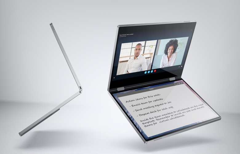 Alternatively you could be video conferencing with one screen and taking handwritten notes on the other, or just keeping an eye on Twitter on one screen while also (pretending) to work on the other. The rest of the hardware is fairly bland – again, these aren't devices that are for sale – though the machined casing, crisp angles, and drilled speaker holes have aesthetic charm of their own. Two USB-C ports are squeezed in by the hinges.