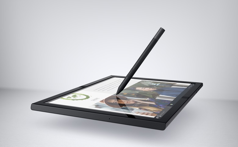 Or, you can rotate it and use half of the device for an on-screen keyboard, while the other half acts as a smaller display. Dell also has a digital pen that will work with Concept Ori, and it's not hard to imagine frequent note-takers being taken by the form-factor.