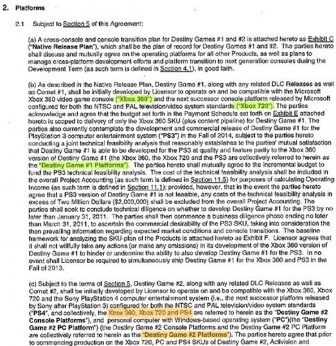 The full document comes from The LA Times but the important section is right here. You'll find "Destiny Game #2" to be the subject of production on the PlayStation 4 and Personal Computer, while the Xbox 720, Xbox 360, and PlayStation 3 are being set for the Destiny Game #1 release. This means – it would seem – that the PlayStation 4 won't be ready for action in time for the release of the first Destiny Game.