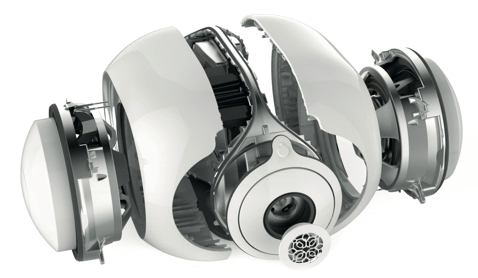 On either side there's a woofer, with an aluminum cone and a pressurized interior, up to 20x as high as in a conventional speaker. On the front, a tweeter in the center is surrounded by a midrange cone. All the components are solid-state, and there are no wires inside. Devialet claims a frequency range of 16Hz to 25kHz – the more typical range is 20Hz-21kHz – and no clipping, since by the time it might happen the speakers are outside of the point of human hearing.