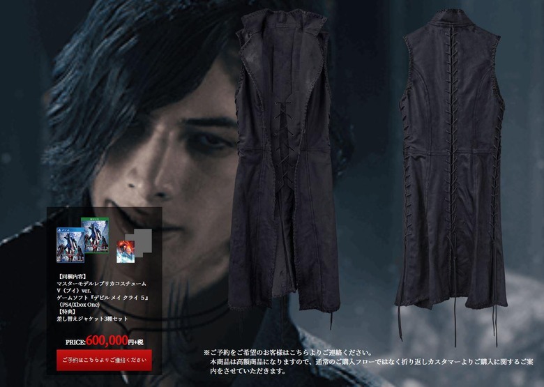 The bundle featuring Dante's jacket is, unsurprisingly, the most expensive of the bunch. Clocking in a ¥900,000, you're looking at paying just a touch under $8,000 for this. Nero's bundle is slightly less expensive, with a price tag of ¥750,000 or $6,648. V's bundle is the least expensive, perhaps owing to the fact that he's a new character and won't have the fan following that Dante and Nero do. Still, you'll be paying ¥600,000 to own his jacket bundle, which translates to a not-insignificant $5,318.