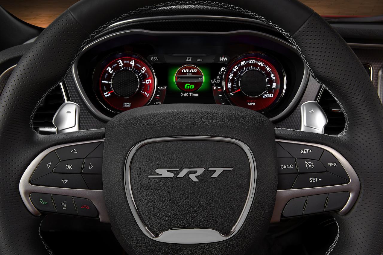 Both versions have Dodge's new Drive Modes system, which includes four different settings that adjust horsepower, shift speed, paddle shifter performance, traction, suspension, and – in the case of the Challenger SRT – steering reaction. As well as the Default mode, there are Track and Sport, in addition to a Custom memory slot in which the driver can save their own choice of settings.