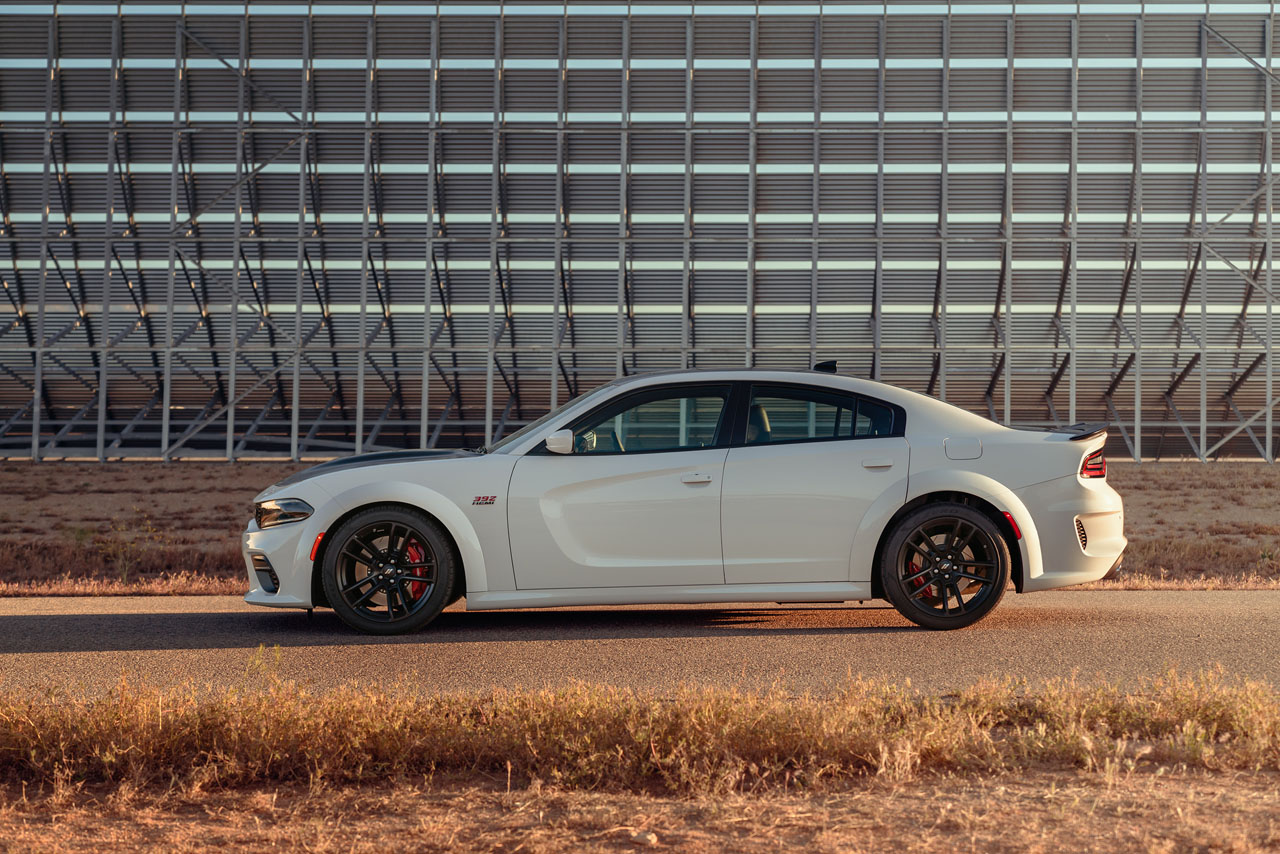 The 2020 Scat Pack Widebody is powered by a 392 ci Hemi V8 making 485 hp and using an 8HP70 8-speed automatic. It has 3-mode adaptive suspension, standard electric power steering, and a wider body that covers 20x11-inch wheels. The car also has a Brembo brake system, stiffer springs, and larger sway bars. The car has launch control, launch assist, and line lock features.