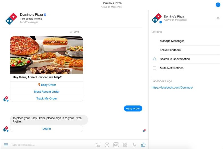 Forget placing an order through Domino's website — the company has made it possible to order a pizza directly within Facebook Messenger via a bot, giving customers in the United States the same feature that has been available in the United Kingdom and Ireland for a short while. In its current form — which will no doubt be refined in due time — users who have an online account and existing orders can use the Messenger bot to reorder their last meal or place an "easy order," as well as track their meal's status.