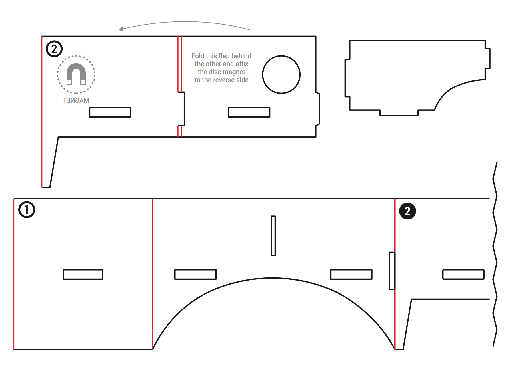 5. Also included in this construction is a single rubber band to keep your phone from slipping out of the headset. Feel free to get creative, of course. Number 6 is an NFC tag which is optional – program it with URL cardboard://v1.0.0 if you do so wish.