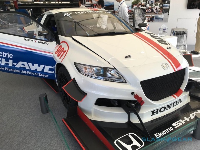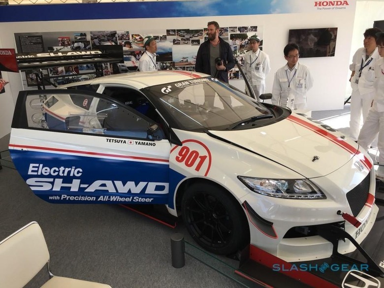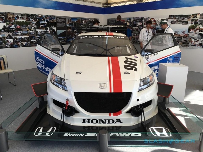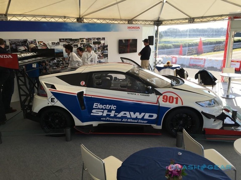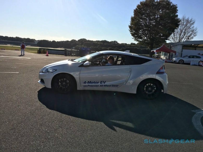 Out went the CR-Z's usual 1.5L hybrid gas engine, and in came four electric motors, one for each wheel. Since each motor can be independently controlled, the torque going to each wheel – and in either direction – can be adjusted individually.