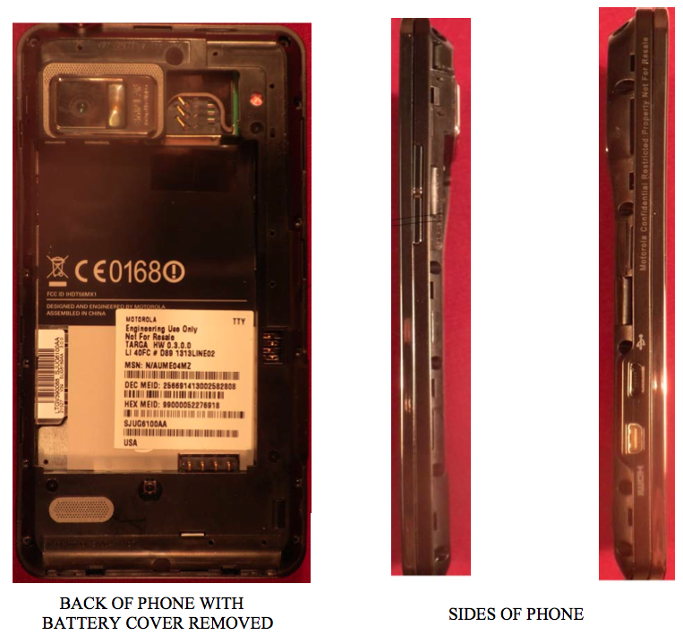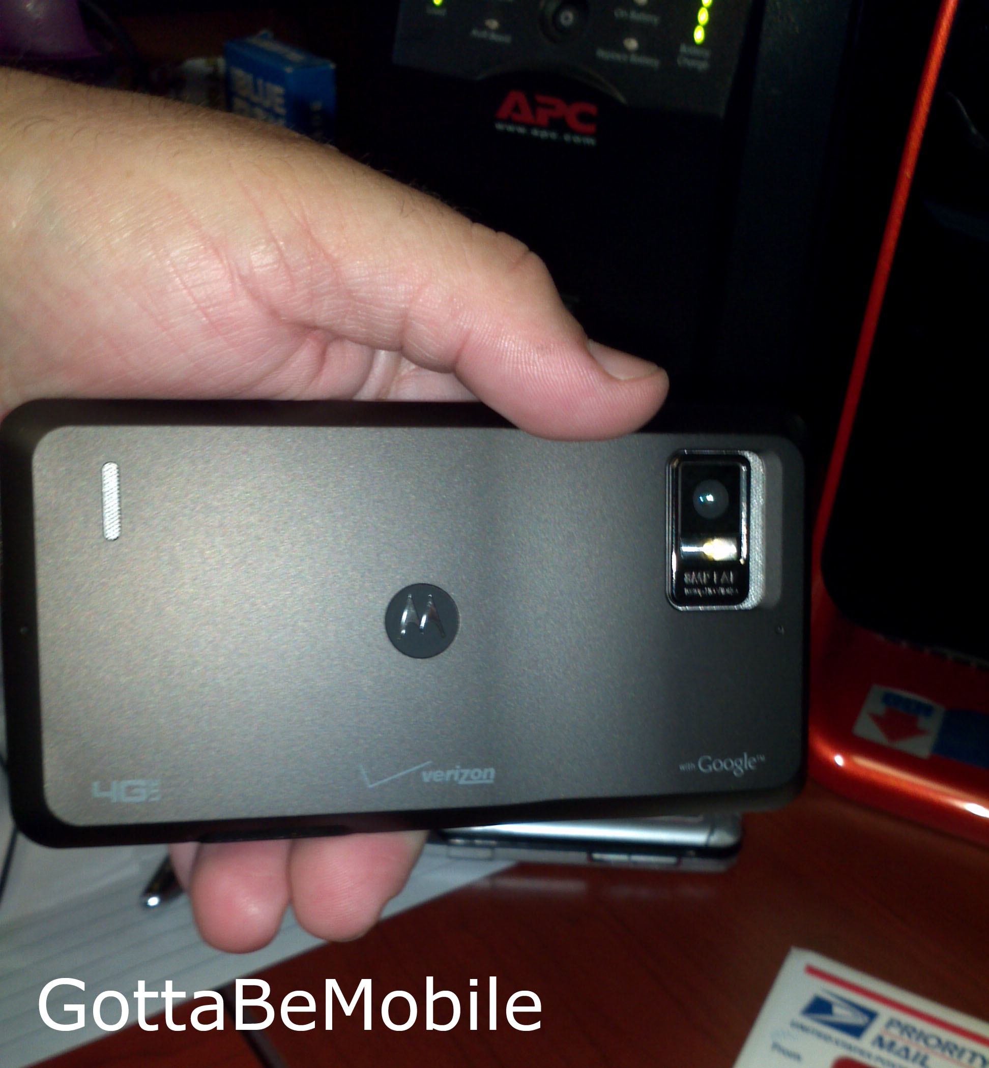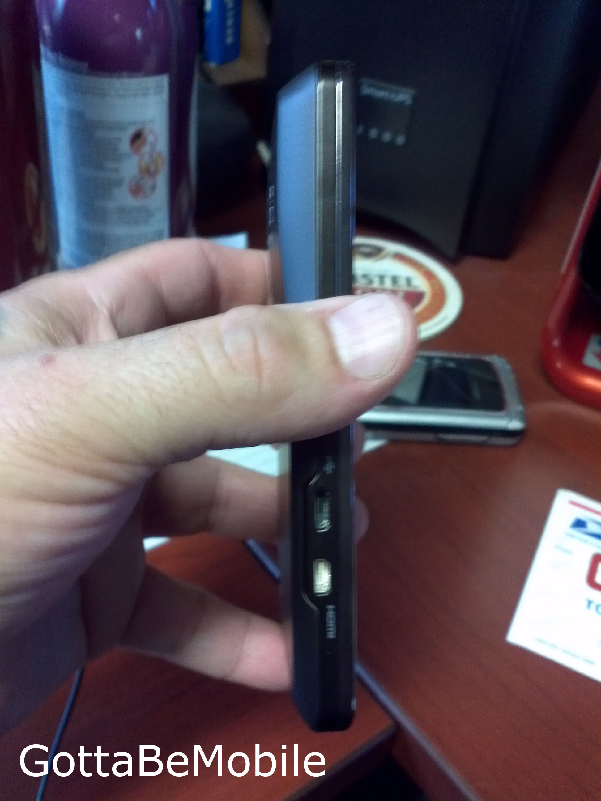 What the newest set of photos shows is again the possibility of curved glass on the front of the device as shown by the light hitting the front lower left of the device, as well as the Verizon logo in the lower right, Motorola in the center on the top near the speaker grill, an at least reasonably bright display, four Android buttons below, and a standard looking border around the whole screen. Along the left side of the device you'll see a recognizable microUSB and microHDMI post combination, this indicating that docks similar to that which we've seen on the Motorola ATRIX and Motorola PHOTON 4G will be in order – this same setup can be seen on the side of the recent DROID 3 just released on Verizon as well.