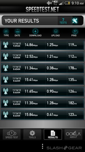 As for LTE performance, we saw stronger download performance than upload, on average. Side by side with an iPhone 5, the DROID DNA pulled in on average 7.97 Mbps, versus 6.84 Mbps on Apple handset for downloads, and 2.05 Mbps versus 1.51 Mbps for uploads. That pays dividends when you're using the DROID DNA as a mobile hotspot, though we did encounter a frustrating intermittent issue whereby our connection to the hotspot would periodically drop. Obviously, LTE performance is very much network and location dependent, and your experience of speeds will vary.