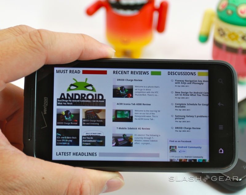 Audio performance on Verizon's network was solid, with little in the way of glitches or distortion. Both we and callers could hear each other's clearly, likely helped somewhat by the integrated noise-cancellation system. What you don't get, of course, is 4G LTE connectivity from the HTC Thunderbolt and DROID Charge.