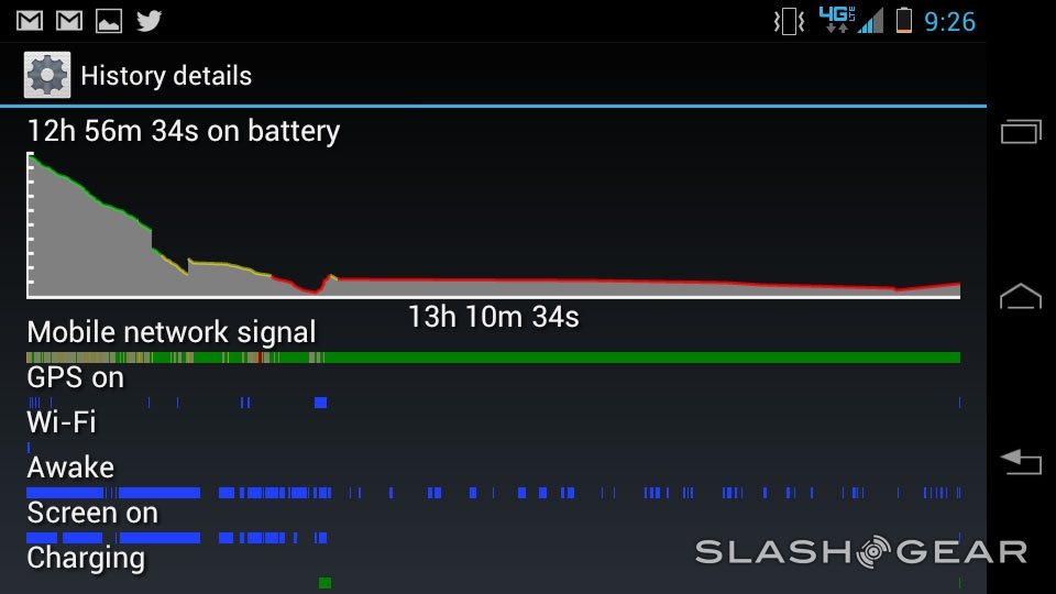 Then have a peek at what happens when you turn the device's display up to full brightness. This chart shows how quickly you can drain the battery – note that this isn't entirely unique to this device, you can make this happen with the right combination of high-demand apps and display power and data transfer and all that good stuff at once. What you should pay attention to here though is the flatline at the end – when the death drop ends, that's where I turned the brightness of the display to "auto."