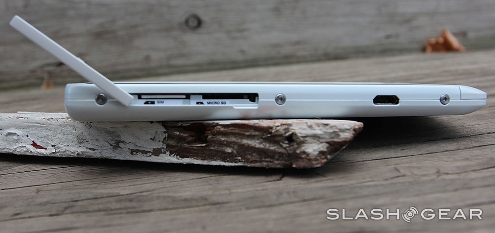 The device does not work with legacy accessories that connect with the microUSB and microHDMI combination as seen on our review of the Motorola Lapdock 100 – here with the RAZR M, you've just got a microUSB port and that's it. You've also got a standard headphone jack at the top of the device, power button and volume rocker on the right, and a door on the left also with a microSIM and microSD card slot as well.