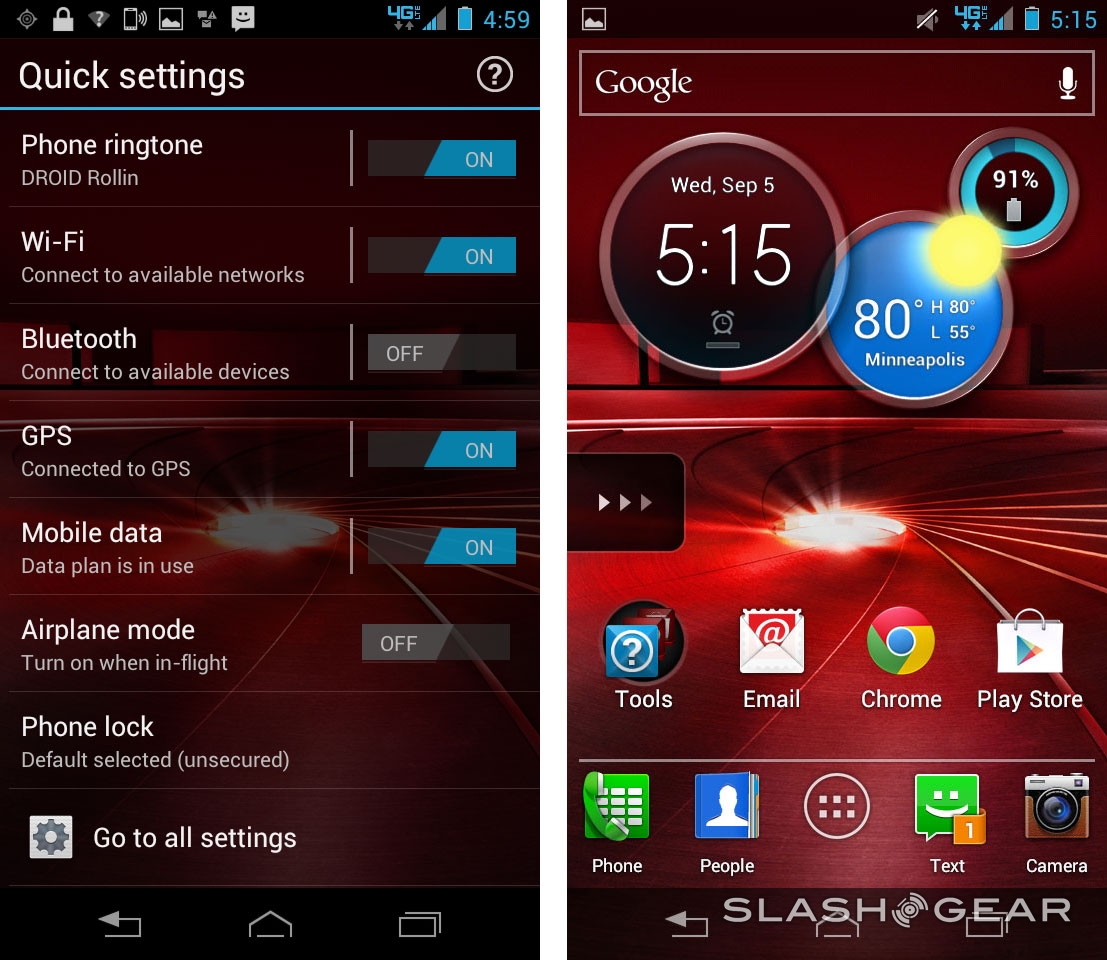 Motorola's user interface works well here with Android's Ice Cream Sandwich features, not being overbearing as it was back when it was called MotoBlur. Here we've got a collection of easy-to-understand icons in your settings menu, features that are well placed (like the previously mentioned Quick Settings menu), and what's not a rather quick software build as it works with Qualcomm's processor. Have a peek at a few benchmark results here as well to see how it adds up compared to the rest of your smartphone and tablet favorites.