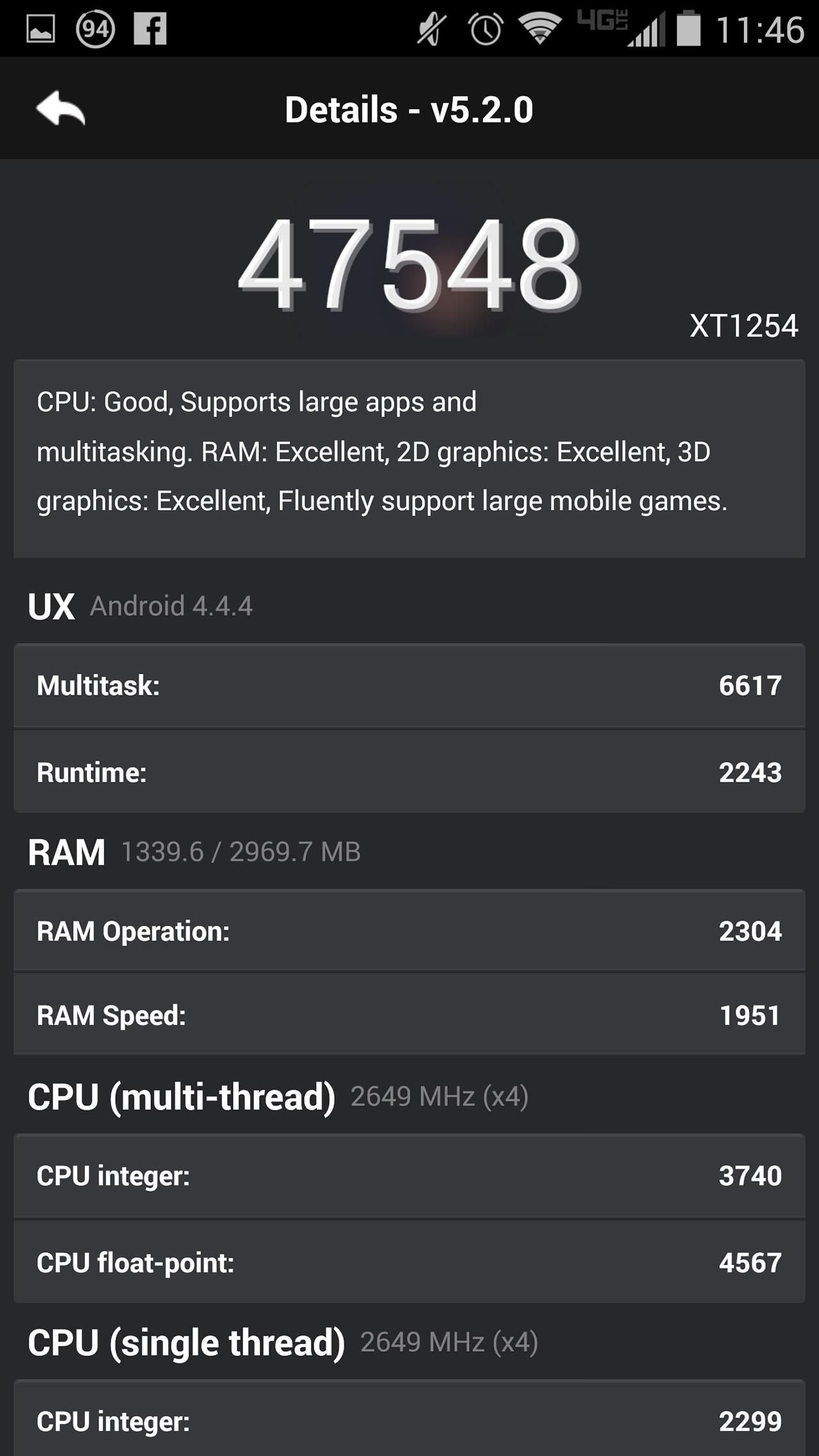 Above you'll see a number of benchmark tests run on the DROID Turbo. Note that we're working with the Qualcomm Snapdragon 805, which means we've got one of the most powerful processors for a smartphone out now – but benchmarks don't mean much else besides how well the phone does on a benchmark.