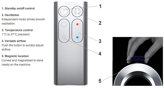 A remote control, for adjusting temperature, airflow and turning on and off the oscillation, is included. It's also slightly bowed and magnetic, so that it can be safely stored on top of the Hot itself rather than getting lost down the back of your sofa.