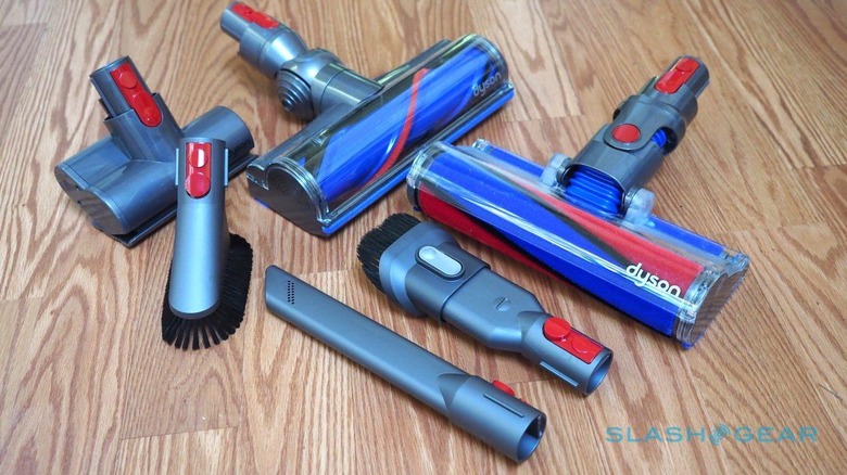 Three of the heads are powered. There's a direct-drive cleaner head, with stiff nylon bristles intended for carpet and anti-static carbon fiber filaments for hard floors, but also a soft-roller cleaner head, with a woven nylon bar that looks like something you'd find in a classic carwash, and which is designed to both sweep and polish hard floors. Finally, a compact version of the direct-drive cleaner head is less than half the width for fitting into smaller gaps.