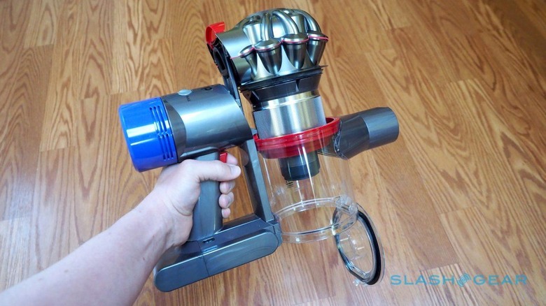 The V8 is a little more complex, involving both pulling up the cyclone assembly and simultaneously releasing the base. In practice, however, it's a big improvement, since lifting the top section also dislodges any tenuous dust or hairballs that might otherwise demand a few sharp raps. Banging your expensive vacuum on the edge of the trash can is a shortcut to cracking it, so anything which prevents that is probably a good idea.