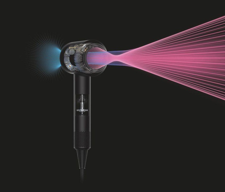 The same Air Multiplier system as used in the company's fans has been brought to bear on your head, pulling in air from the handle and the rear of the dryer to supposedly amplify it threefold and then focus it – at a 20-degree angle – onto the hair. Three airflow settings are offered, along with four heat settings.