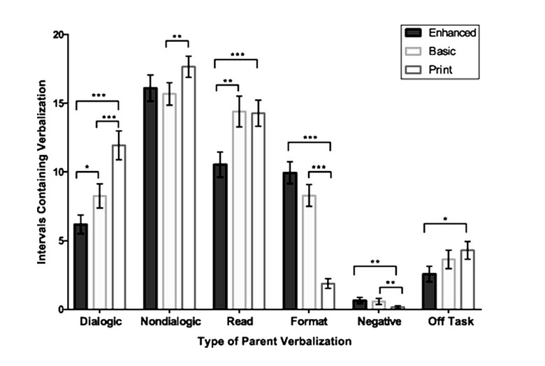 In this recent study, parents "showed significantly more" dialogic, text-reading, off-task, and total verbalizations with print books. Toddlers in the study "showed more" book-related verbalizations, total verbalizations, and higher collaboration scores with print-book reading. Some of these scores are shown in a basic chart (from the study) shown below.
