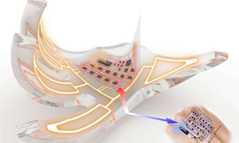 The solution here consists of a set of e-skins, or electronic skins, that use wireless tech to communicate. These skins work with a spatially fragmented circuit configuration, allowing them to stretch in a variety of ways. As you'll see in the tiny video in this article, this means machines will be able to fit themselves into some tight spaces.