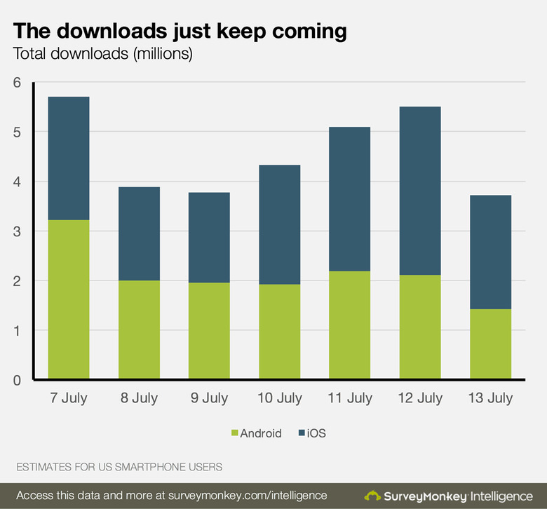 The firm starts off its report by telling us that just yesterday alone, it estimates around 24 million Americans played the game. That's an absurd number of players for any mobile game, with SurveryMonkey pointing out that at this point, more people are using the Google Maps-powered Pokemon GO than they're using Google Maps itself. The app is enjoying 4 to 5 million downloads per day, which is the reason its rising so quickly through the ranks of the most popular apps.