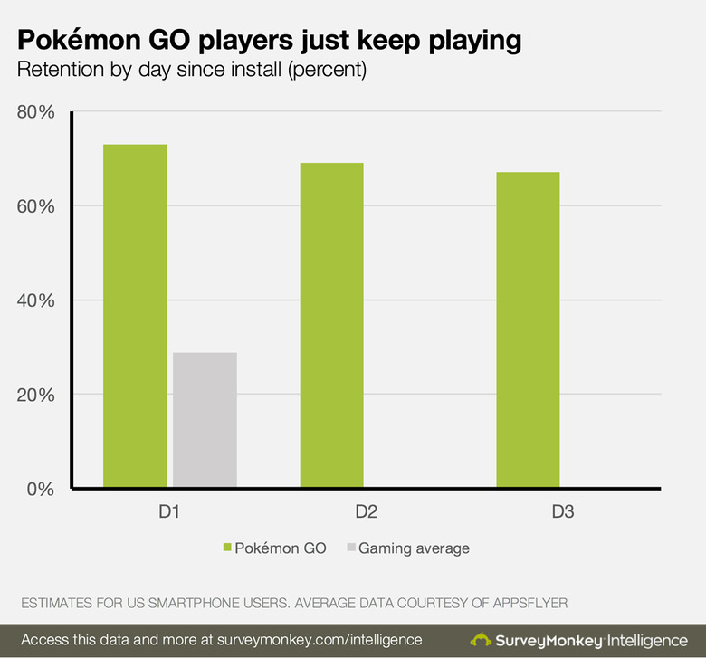 The number of active players or where it ranks among the most popular apps in the United States aren't even the most impressive parts of the report, though. SurveyMonkey estimates that a staggering 7 out of 10 users who download the game play it again the next day. This statistic, called day-one retention in the mobile apps space, is an important metric for developers, and even though Pokemon GO's numbers are impressive enough to stand on their own, they're made even more impressive by the fact that the industry average for D1 retention is usually around 3 out of 10.