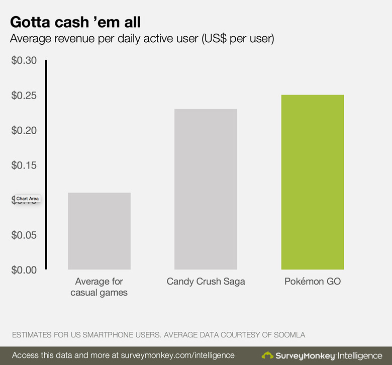 What's more, the final estimate of SurveyMonkey's report may be the most important one for the future of Pokemon GO. The report estimates that the game is pulling in an average of $0.25 per active user each day, which would be enough to put it above Candy Crush Saga in terms of daily revenue per active user. As the report points out, that kind of revenue is more than enough to motivate Niantic and Nintendo to keep players engaged through things like content updates that would add Pokemon and features to the game.