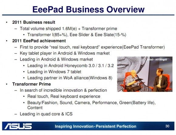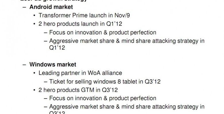 ASUS' Eee Pad Transformer Prime will launch on November 9, according to an investor conference presentation, with two further Eee Pad "hero products" expected in Q1 2012, as the company attempts to build on the success of the first-gen Transformer. Meanwhile, Windows 8 tablets are set to follow on later in 2012, according to the slide desk [pdf link], though the first such models won't arrive until Q3 next year.