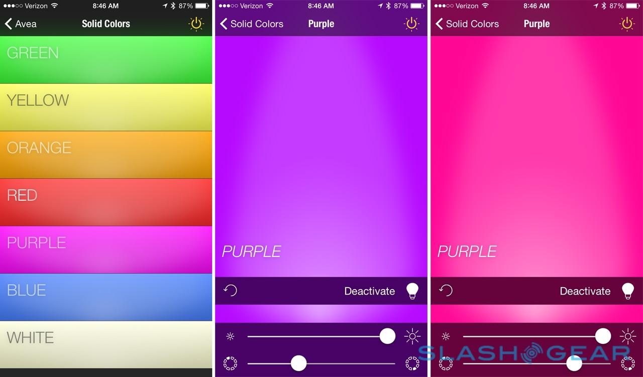 It's worth noting that simply hitting the color category doesn't actually change the bulb color straight away: instead you need to hit "Activate". After that, any brightness tweaks or other adjustments are instantaneous. Colors themselves are fairly bright, though a hue bulb offers more saturation, at least to my eyes, and Philips' range of white tones (from cool through to warm) seems broader.