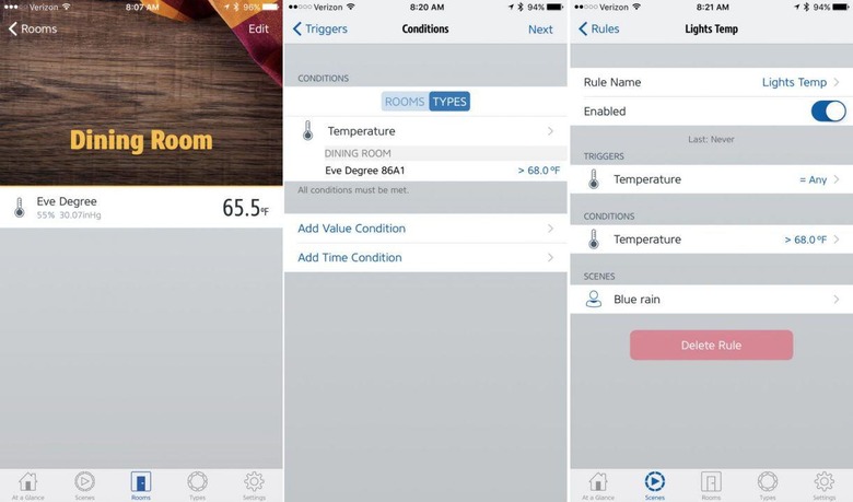 After that, Eve Degree's temperature and humidity readings will show up in the iOS Home app. While you can set up new automations within that app, right now Eve Degree doesn't show up as a trigger. To create a rule, you need to head into Elgato's own Eve app.