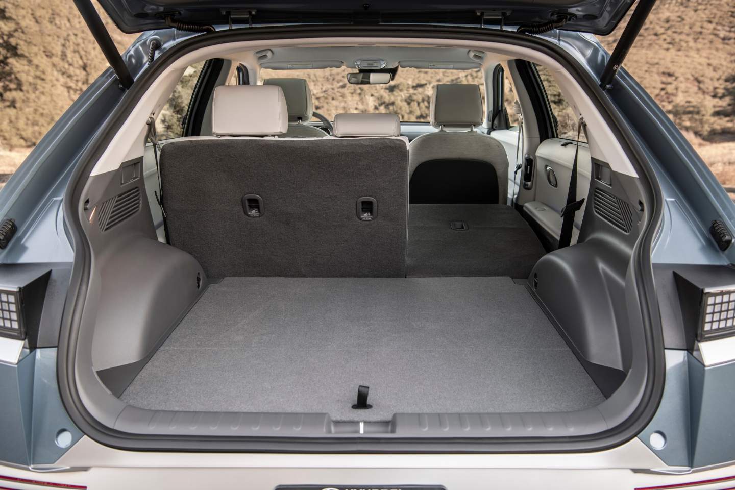 Combined with shorter front and rear overhangs, Hyundai claims Ioniq 5 has a greater passenger volume than the Ford Mustang Mach E and VW ID.4. In addition, Ioniq 5 has 27.2 cubic feet of cargo room behind the rear seats. Meanwhile, folding the rear seats reveal 59.3 cubic feet of storage space.