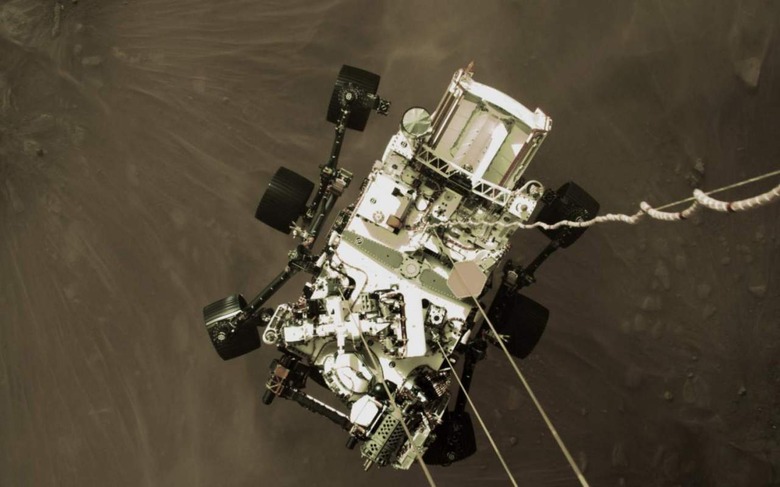 The last 70 feet or so saw the rover lowered on tethers from the jetpack, with NASA's still-jaw-dropping Sky Crane system. That allows for a smoother, more controlled landing of Perseverance even if the ground underneath it is uneven. The jetpack then flies off to leave Jezero Crater – the rover's new stomping grounds – unmarred.