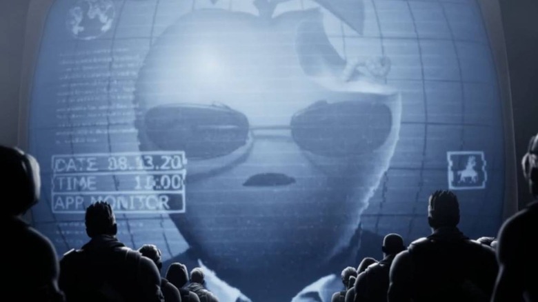 It turns out that Epic isn't satisfied with merely mentioning 1984, as it released a new Fortnite video that is itself a parody of one of those ads Apple ran back in 1980s. In the video, we see a number of greyscale Fortnite characters shuffle into a room where a character with an apple for a head is speaking on a telescreen. Another Fortnite character, this one in full color and wielding a unicorn pickaxe, runs into the room and smashes the screen, seemingly breaking everyone out of their haze.