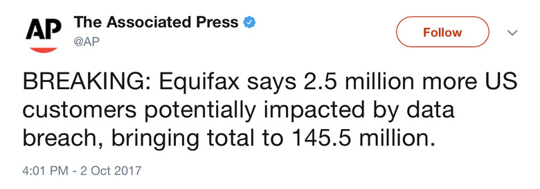 Equifax announced today that 2.5-million previously uncounted US-based victims were "potentially impacted" by their data breach. While Equifax continues to call them "customers", the vast majority of these users were victimized by the credit company itself, seeking out and purchasing their personal info before holding it in a series of insecure web-connected locations. Thus far the Equifax data breach puts 145.5-MILLION US citizens in the "potentially impacted" category.