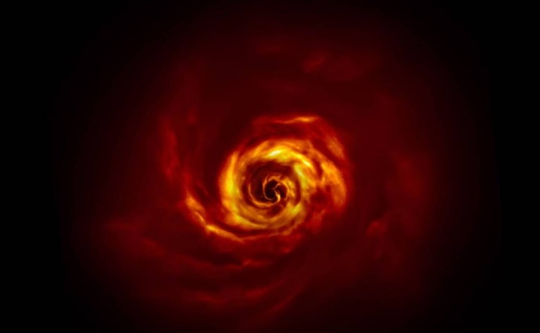 Scientists say that spirals of this type signal the presence of baby planets, which kick the gas, creating disturbances in the disc in the form of a wave. The very bright yellow twist in the region near the center, the image shows signs of planet formation. The formation lies at about the same distance from the star as Neptune from the sun.