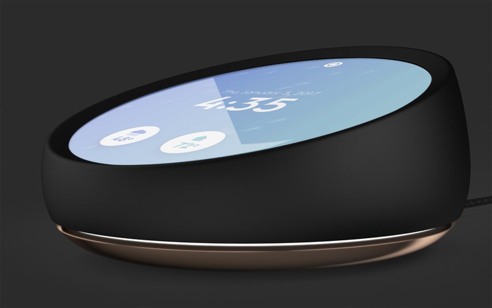 The device consists of a wall plug (for power) and a base with a round touchscreen display. This device has at least one microphone and a glowing light (or array of lights) to show pertinent updates for the user. Essential calls the screen a "round auto-display [which] blends into any home environment while providing seamless access to multiple types of information and services."