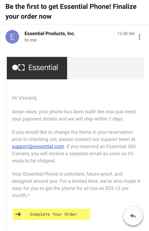 Last week, we learned that Essential was able to attract some high-profile investors, including Amazon and Tencent. At the same time, Essential president Niccolo De Masi revealed that the phone's release was still a few weeks out, noting that more would be shared in a week's time. Now, precisely one week later, early adopters are beginning to receive these shipping alerts.