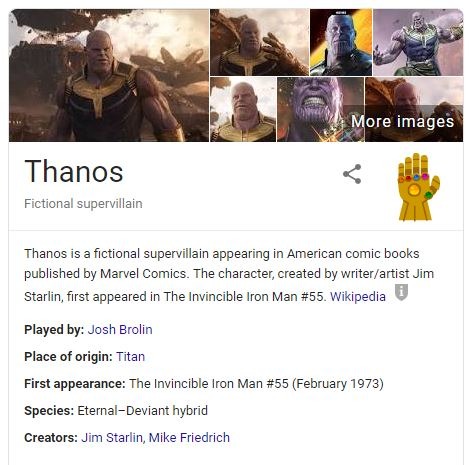 Now that the warning is out of the way, searching Google for "Thanos" will return a mostly normal page of search results, with one key addition: the Infinity Gauntlet has appeared in the right side information panel on the Mad Titan. Click or tap on that Infinity Gauntlet to watch Thanos snap his fingers, complete with accompanying dramatic sound effects.