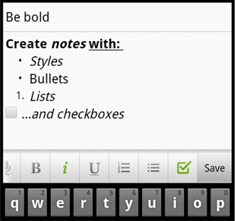 Inside notes, inside New Notes more specifically, you'll see that along the bottom of the note (and above your screen-based keyboard) there's a row of options that allow you to interact with your note in several new (and some old) ways. There's one that allows you to choose a notebook, another to assign tags, you can attach attachments and take snapshots with your built-in camera. You'll be able to record a note with audio, change your text to bold, italic, underlined, etc and make checklists. Simple and well done!