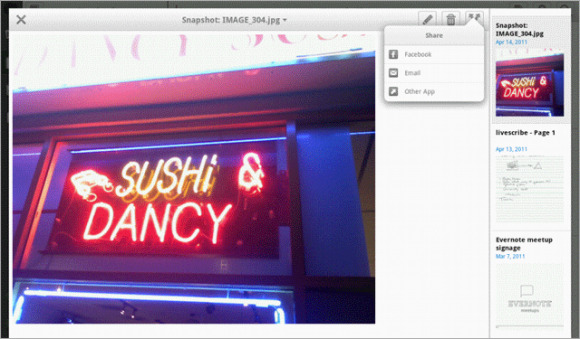 Single Note View is another place you'll be quite often, a new feature here being the scrollable sidebar that lets you see other notes that you may want to jump to without leaving single note view. From here you're also able to share the note to Facebook, email, or other apps (these showing up based on what you've got stacked up in your tablet already. Google Plus anyone?) Twitter is also amongst these "other" services.