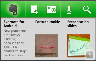 Finally, there's an Evernote Widget that you'll be able to place on any of your homescreens (provided you've got the space) that allows you quick links into a new note, a snapshot that you'll be able to add to a note, voice recording for a note, and search. You can also see your most recent notes below this first line of shortcuts. Cool beans!