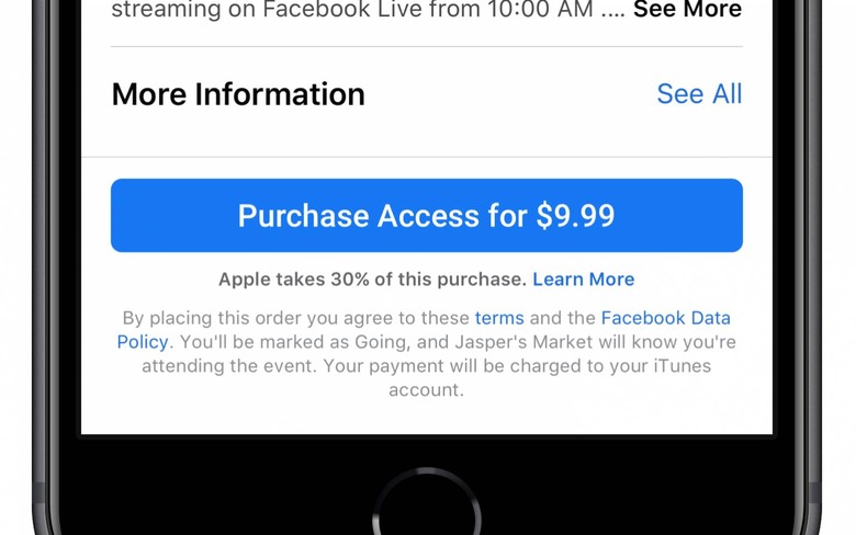 On iOS devices, such as in the Facebook for iPhone app, there'll be an explanation under the payment button stating that "Apple takes 30% of this purchase." On the Android version of the app, it'll say "Facebook doesn't take a fee from this purchase," meanwhile.