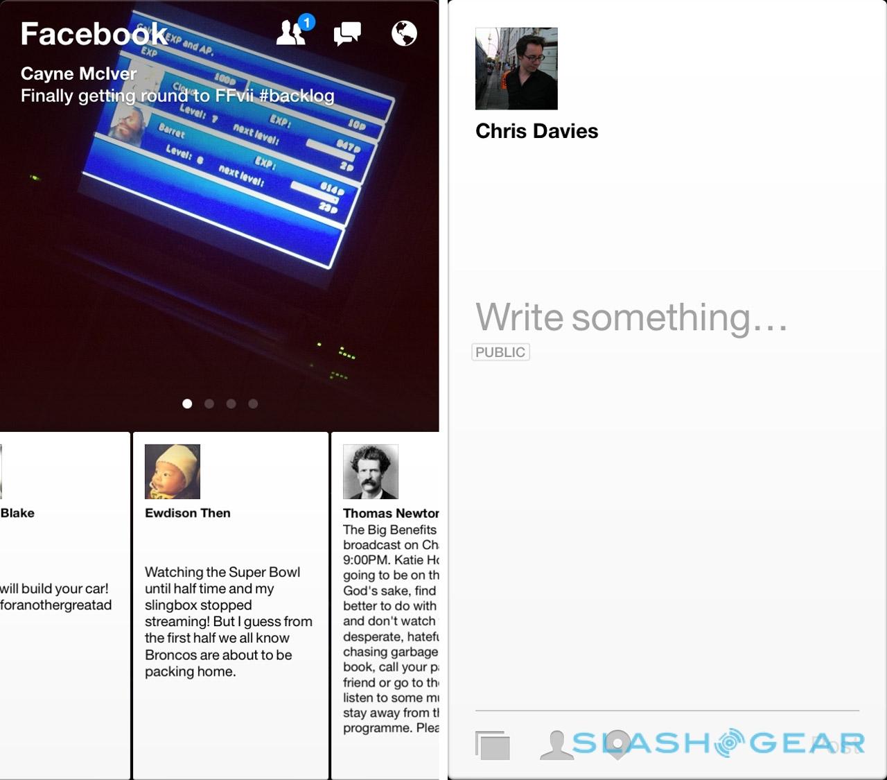 What's especially notable is how much fresher it all feels compared to the existing Facebook app. The greater focus on photos, showing them off in as chrome-less a way as possible, borrows the interface gloss we liked of Facebook Home but without feeling like it was hiding the meat of the content underneath.