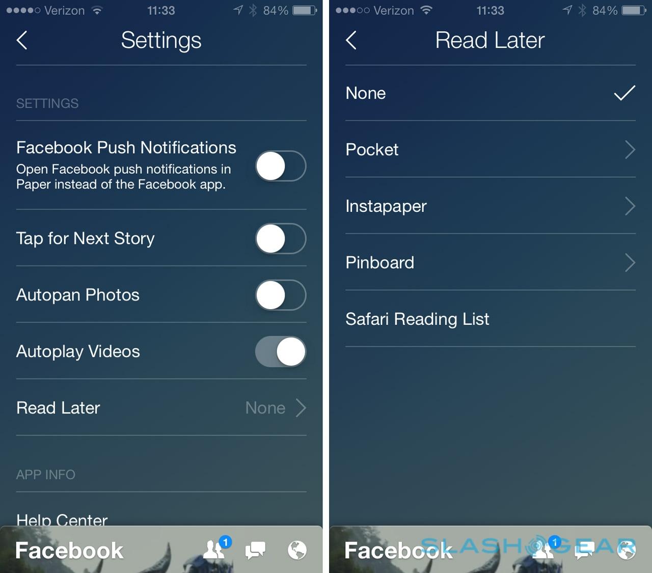Settings like that are found in a relatively sparse page accessed by pulling down on the main view, exposing a main menu. From there you can make a new post on your Facebook wall, edit which categories are included in your feed, and change the settings; there's the option to toggle where Facebook push-notifications open, in Paper or the original Facebook app, as well as whether videos autoplay and if tapping opens up the next article.