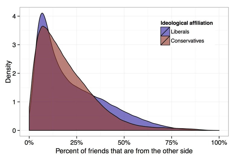 According to Facebook's data, gathered in the six months between July 2014 and January 2015, on average 23-percent of a user's friends claim an opposing political ideology.