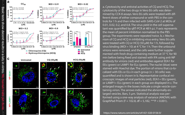**This study ran no clinical trials with human patients with the HCQ malaria drug. That study showed HCQ to "efficiently inhibit SARS-CoV-2 infection in vitro." The study's authors made special note of the fact that HCQ is toxic, and "prolonged and overdose usage can still cause poisoning." They concluded, saying "the relatively low SI of HCQ requires careful designing and conducting of clinical trials to achieve efficient and safe control of the SARS-CoV-2 infection."