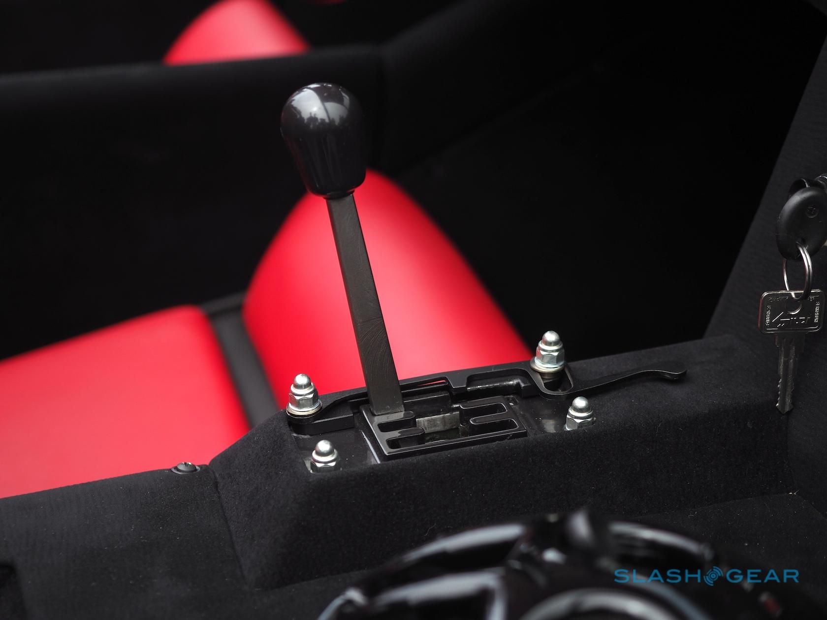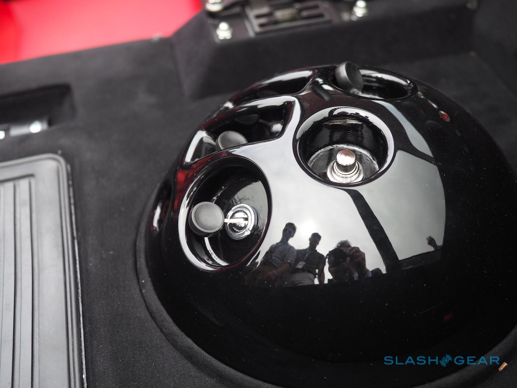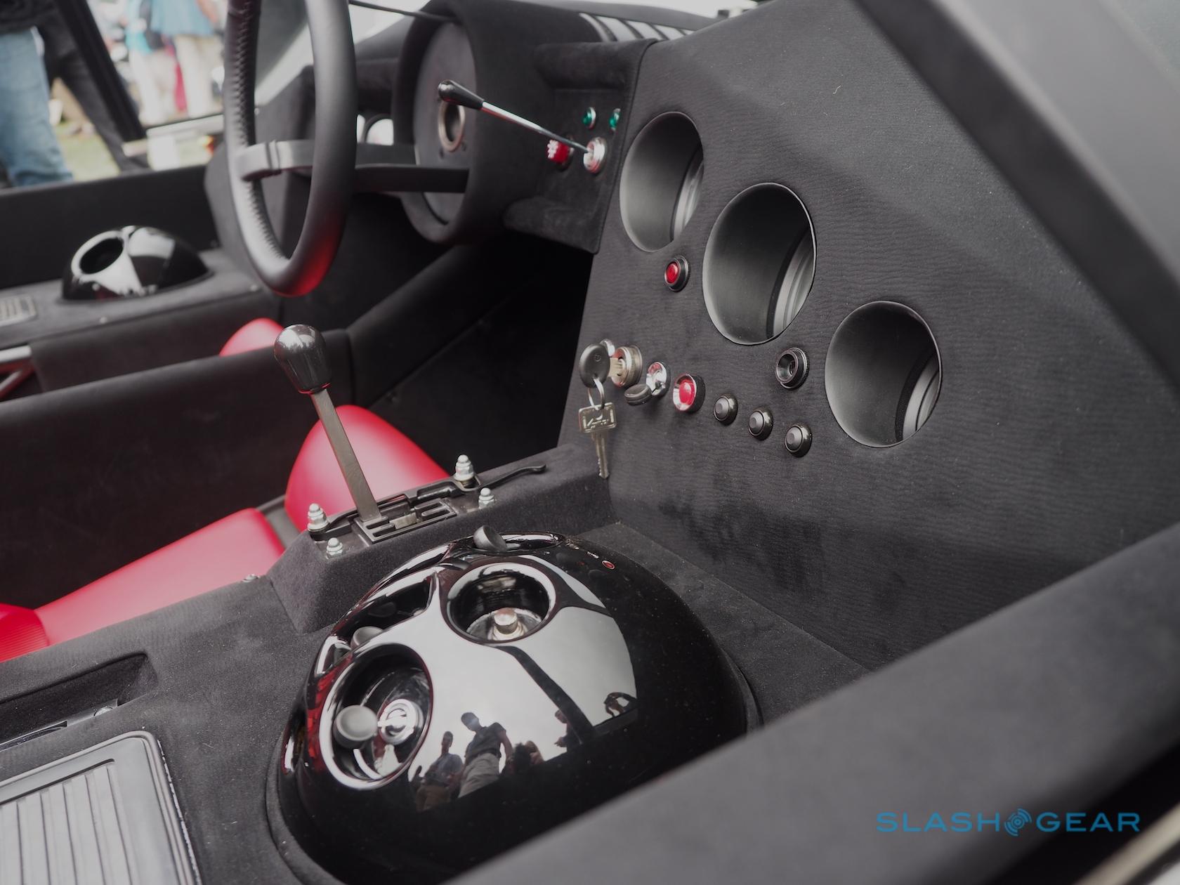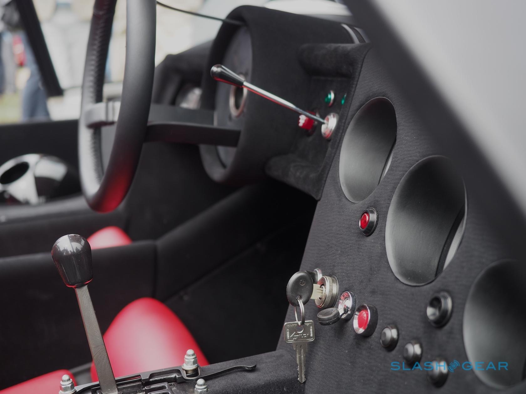 Even with just two seats, though, it's remarkable. The hub-less steering wheel protrudes on three long struts, unadorned by controls or stalks. It's flanked by an array of analog gages and tactile-looking switches and buttons, along with black-topped levers for the transmission and other controls.